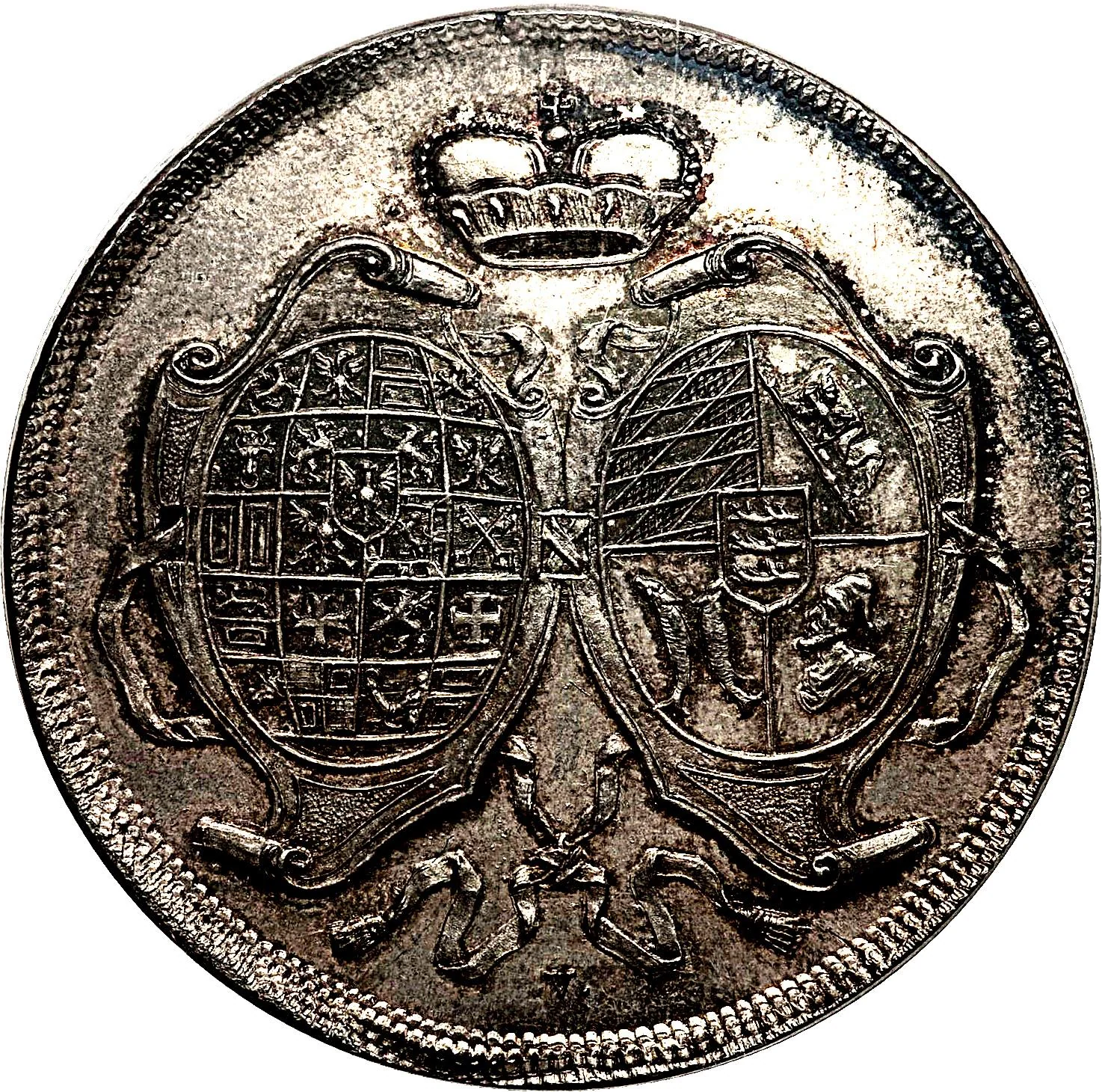 Brandenburg and Württemberg-Oels arms in a crowned cartouche, bound by a knotted belt. Mintmark below.