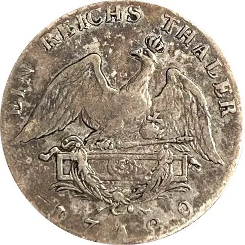 Prussian eagle on pedestal with scepter and orb, above laurel and palm wreath. Date and mintmark at bottom.
