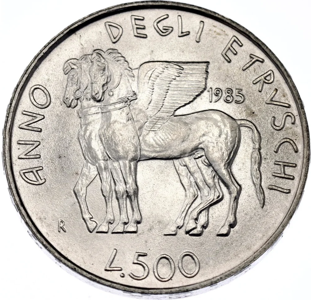 Tarquinia’s winged horses coin, with value, mintmark, and date.