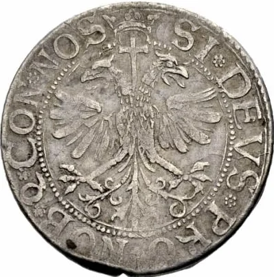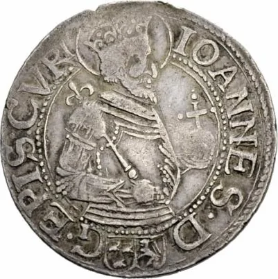 Half-length figure of Saint Lucius facing right, bearded, holding orb and scepter, with two shields below.