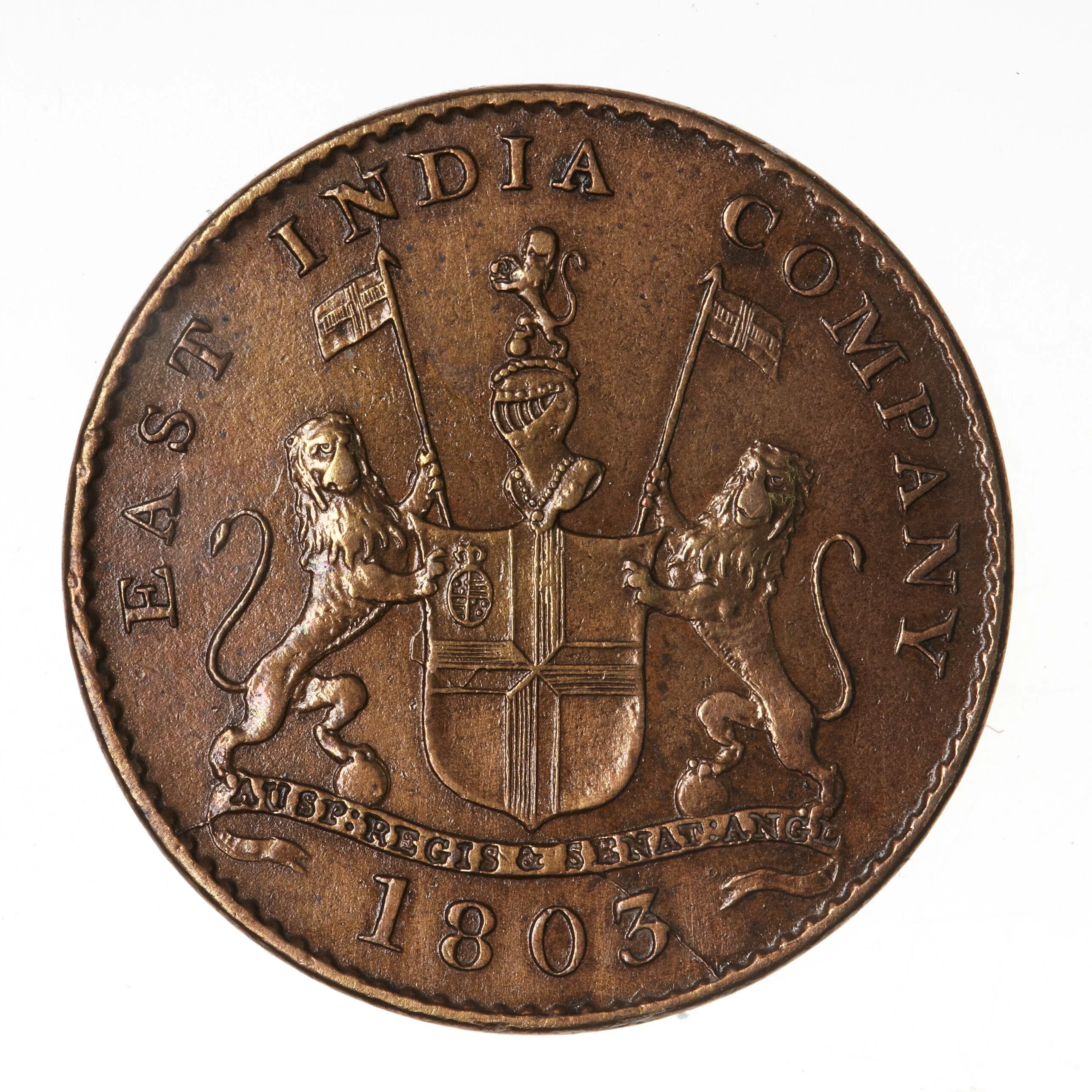 The East India Company's coat of arms features the Latin motto "Auspicio Regis Et Senatus Angliae" on a ribbon, with a date below, all encircled by a toothed rim.