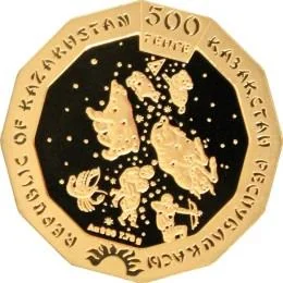 Description: The coin's obverse features the mythological symbols of the celestial constellations at its center, along with specifications of its metal, purity, and weight. A wide border encircles the perimeter, bearing the face value "500 ТЕҢГЕ", the inscriptions "ҚАЗАҚСТАН РЕСПУБЛИКАСЫ" and "REPUBLIC OF KAZAKHSTAN", and a stylized sun.