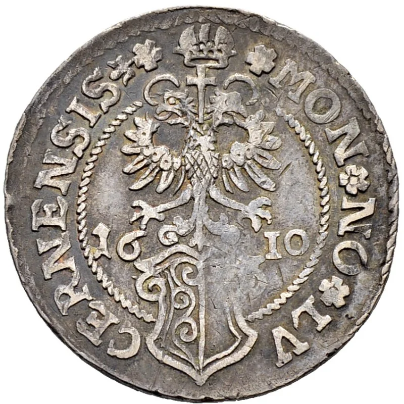 Coat of arms of Lucerne: left side vegetal motifs, right side plain. A nimbate double-headed imperial eagle above, topped by a cross and crown. The year's first two digits flank the left, last two digits the right.