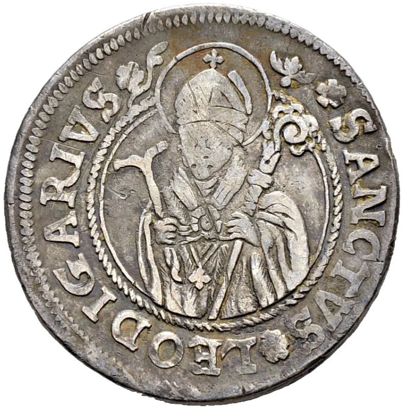 Half-length figure of Saint Leodegar, facing left, with nimbus and mitre. He wears episcopal robes, a cross, holds a hand drill in his right hand and a crosier in his left.