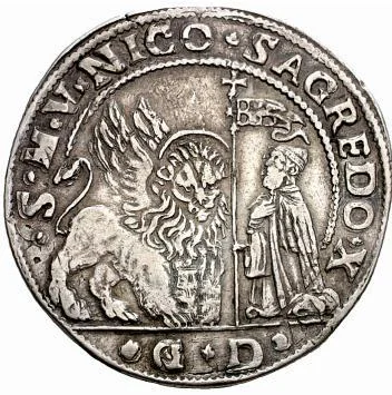 St. Mark's lion left, kneeling doge right holding cross-topped staff; mintmaster's initials below.