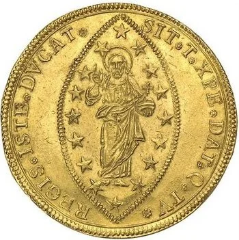 Saint Mark presents his cross-topped staff to a kneeling doge.