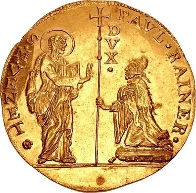 Saint Mark presents his cross-topped staff to a kneeling doge.