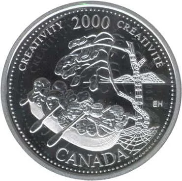 A scene blending three millennia of art: an Inuit boat left, a Group of Seven-style tree upper right, a wireframe landscape right, with "Creativity" in English and French flanking the date and country name.