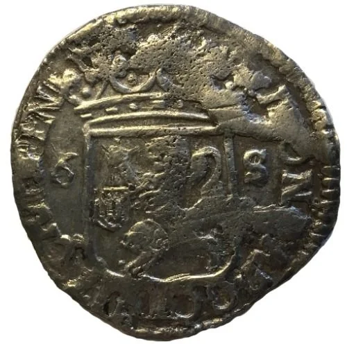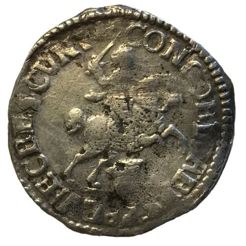Crowned knight on horseback, sword raised, coat of arms beneath.
