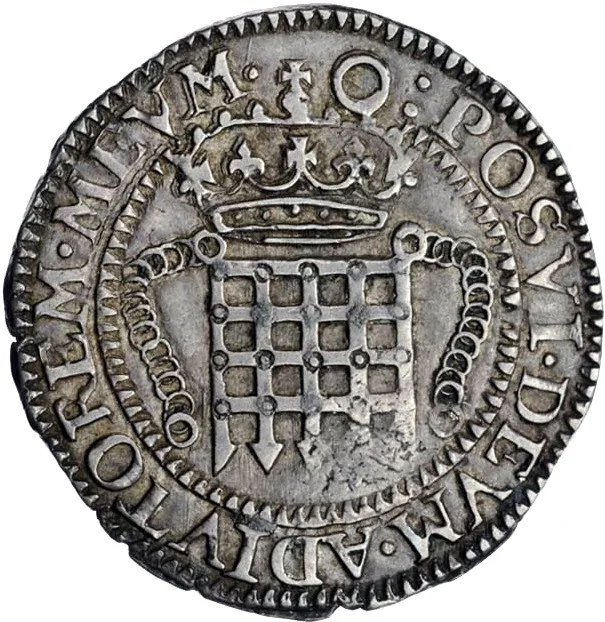 Crowned portcullis with chains, encircled by teeth and outer legend.