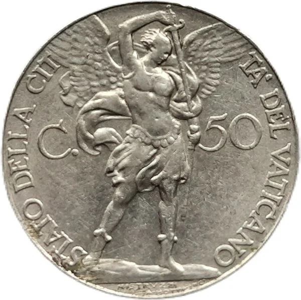 A statue of Archangel Michael with a sword between C. and 50.