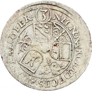 Three shields (Upper Alsace, Austria, Ferrette) arranged in a trefoil, divided by arabesques within a plain circle; value in round frame above.