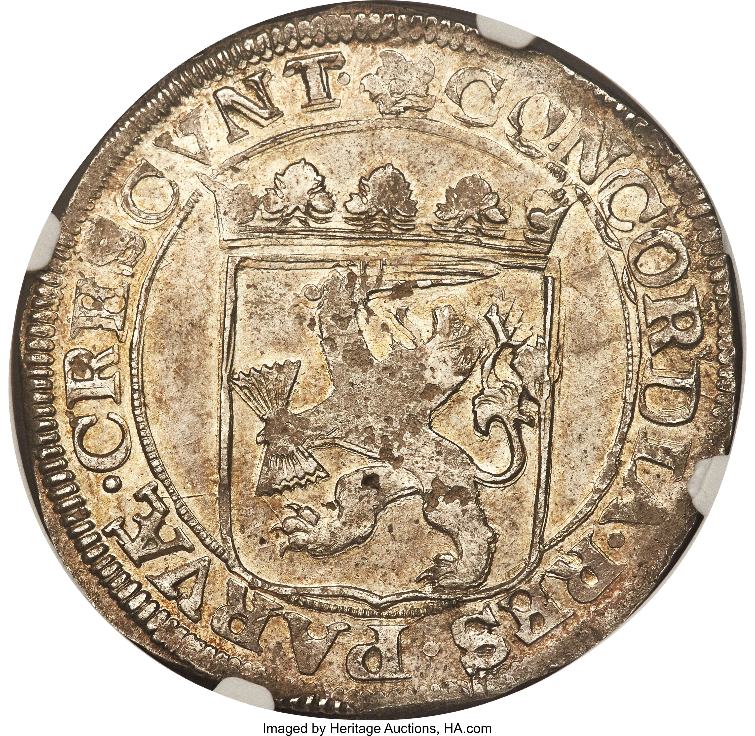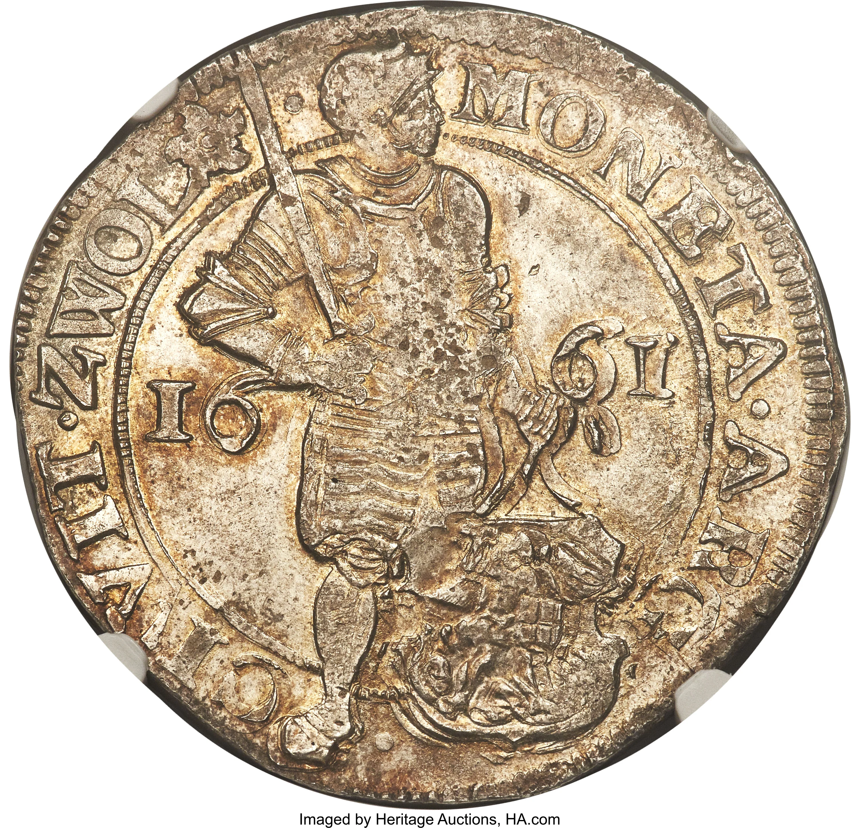 Armored knight standing, facing right, sword on shoulder, left hand on shield depicting Saint Michael slaying a dragon, date divided in inner circle.