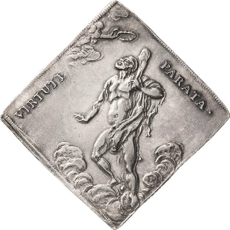 Hercules on a cloud, crowned by a hand from above.