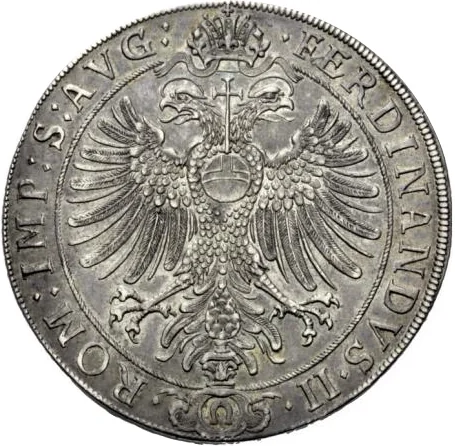 Imperial eagle with orb, Augsburg pinecone below, and Ferdinand II's titles.
