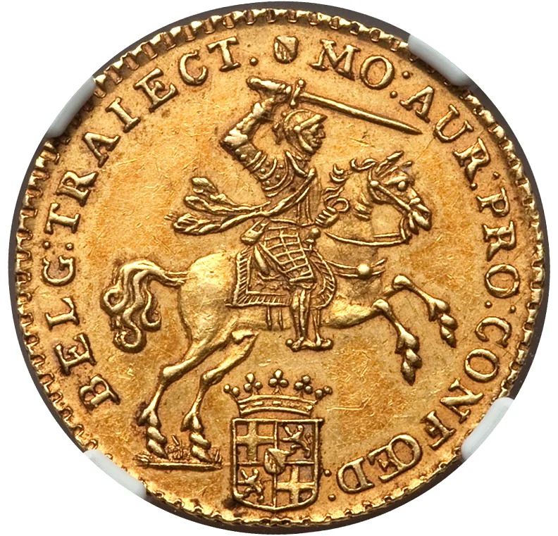 Armored knight on prancing horse, holding sword, above Utrecht’s crowned arms.