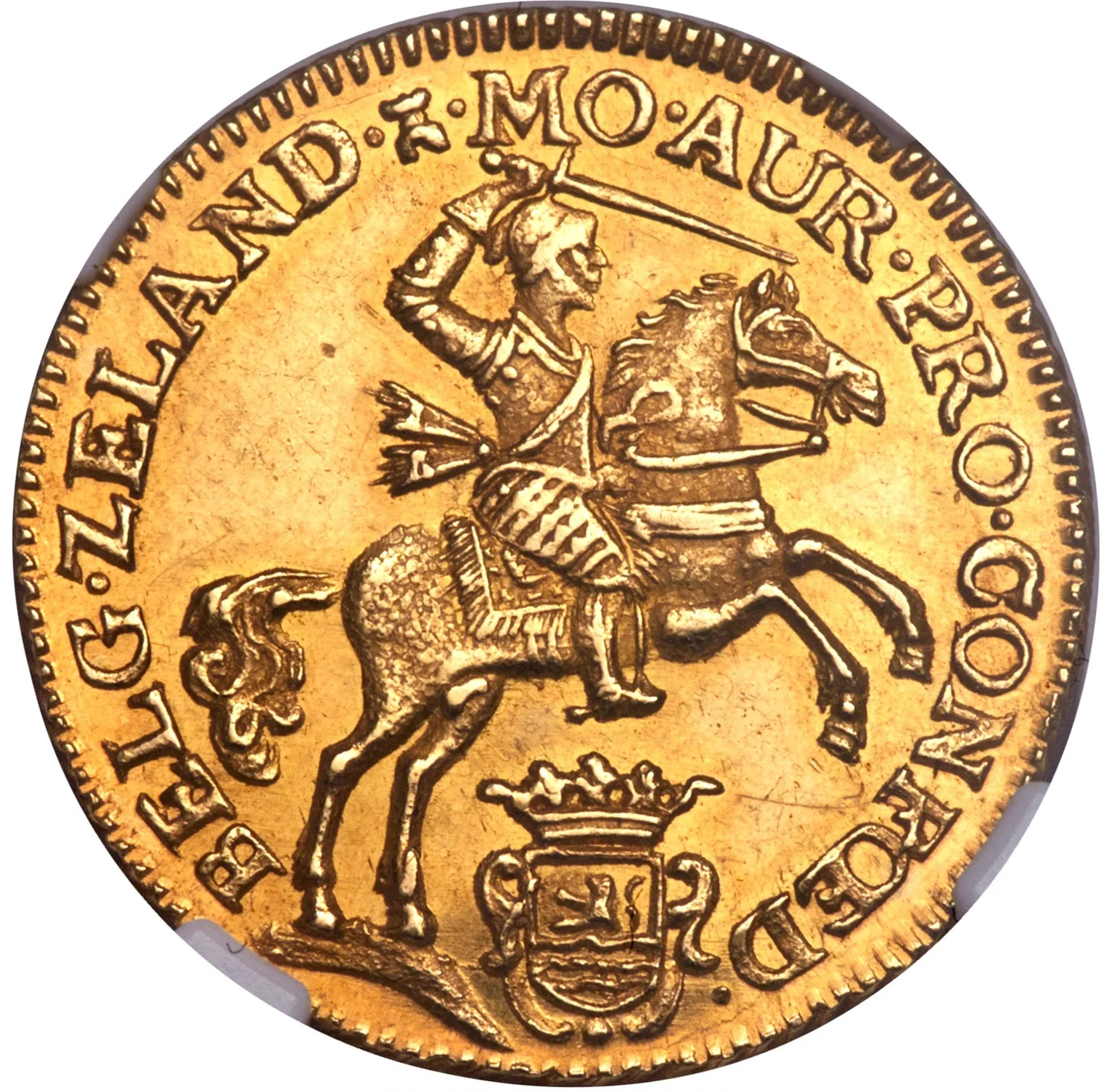 Armored knight on prancing horse, brandishing sword above crowned arms of Zeeland.