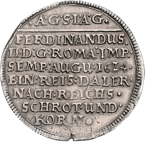 .A.G.S.I.A.G. // FERDINANDUS. // II.D:G:ROMA:IMP: // SEMP:AUGU:16Z4. // EIN:REIS:DALER. // NACH:REICHS. // SCHROT.UND. // KORN.