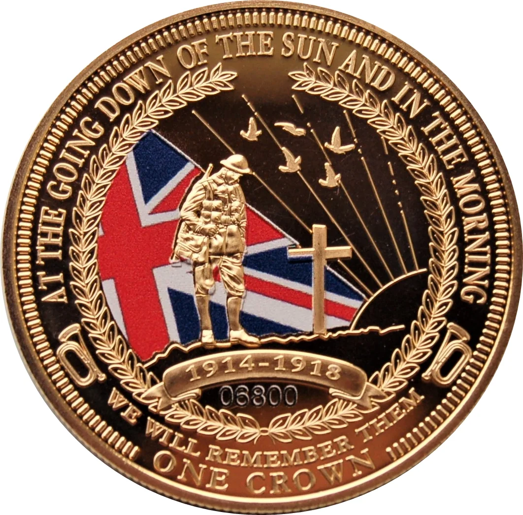 A lone British soldier stands at a cross, backed by a Union Flag, with the dates 1914-1918.