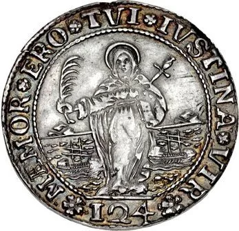St. Justina holding palm and book, with ship, island, and "124" below.