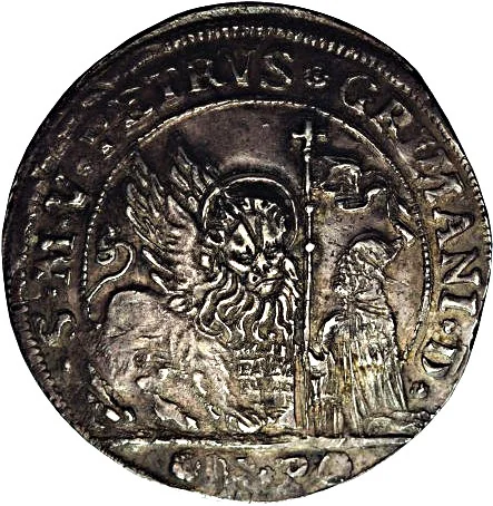 St. Mark's lion left, kneeling doge right holding cross-topped staff; mintmaster's initials below.