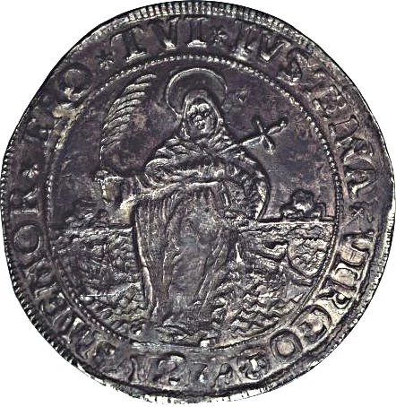 St. Justina holding palm and book, with ship, island, and "124" below.