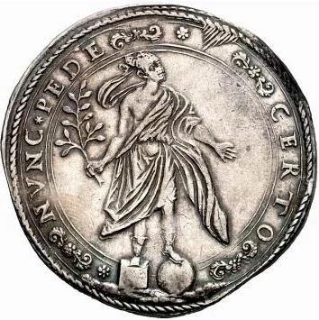 Robed woman holding a laurel branch, standing on a cube and globe.