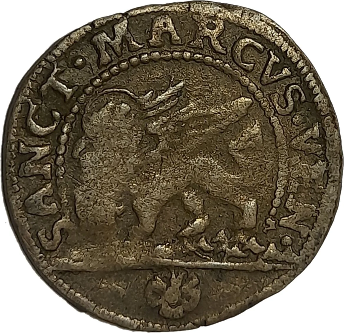 Kneeling Doge holding cross-topped staff with pennant; date below.