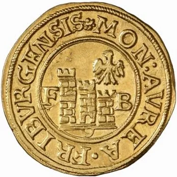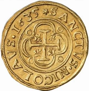 Cross within a double quatrefoil, leaves at intersections, encircled rings. Dated legend.