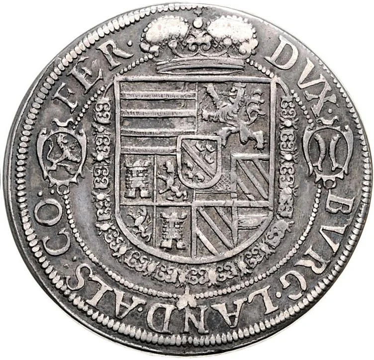 Shield with central Upper Alsace crest, encircled by Golden Fleece chain and inner beaded ring. Outer legend flanked by Habsburg and Ferrette shields.