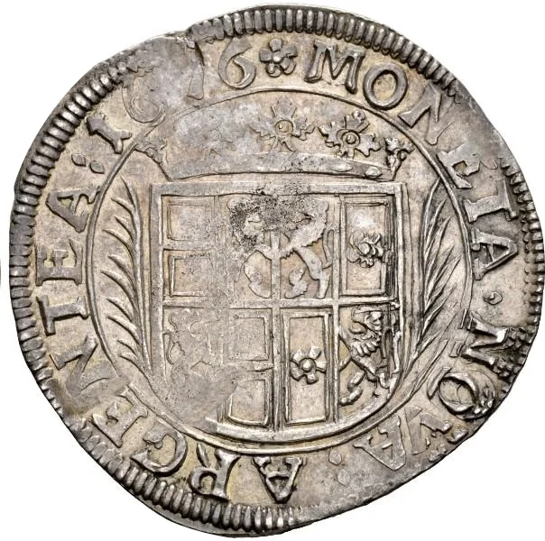 Crowned arms flanked by branches or ornaments.