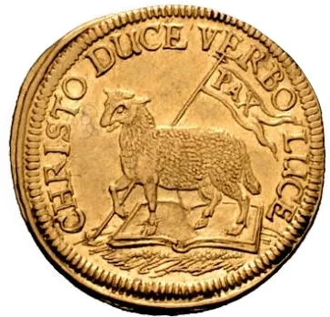 A lamb atop a large bible holds a peace banner.