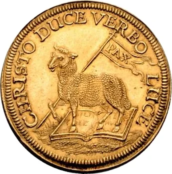 Paschal lamb left, standing on a large Bible, holding a peace banner. Legend above.