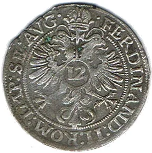 Imperial eagle with crown, denomination on chest, surrounded by Ferdinand II's titles.