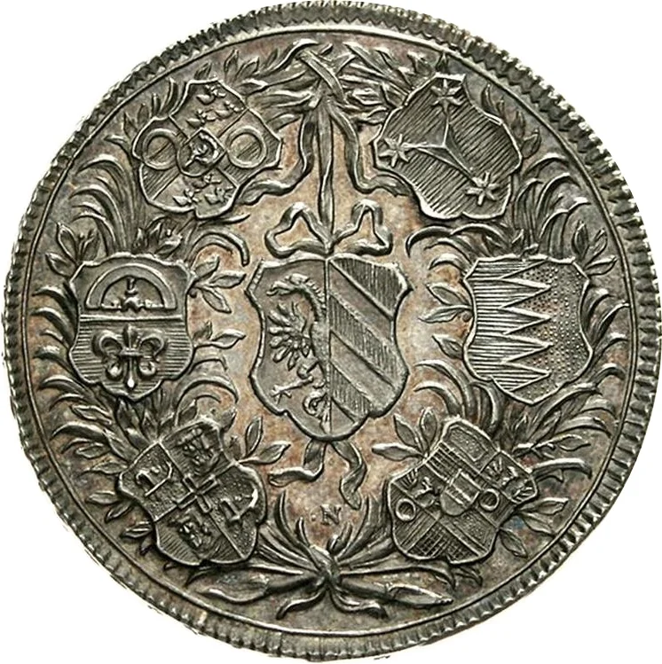 Six shields encircling a central shield.