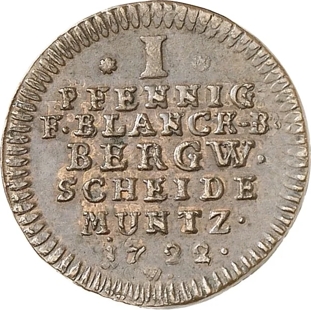 * I * / PFENNIG / F. BLANCK-B. / BERGW. / SCHEIDE / MUNTZ · / 1722 · / W ·