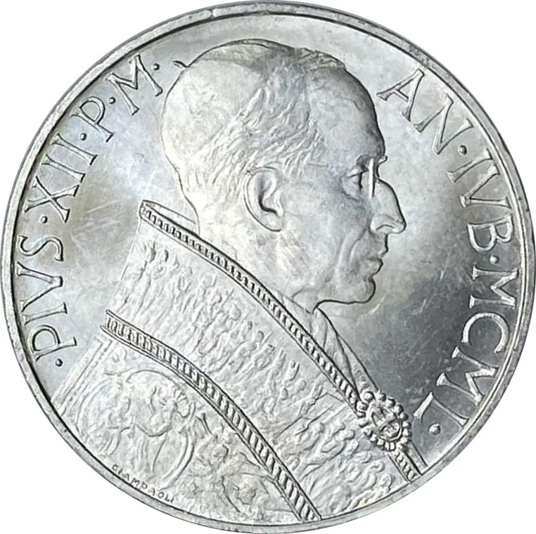 The issuance of currency was governed by a specific convention with the Italian Republic. Coins were minted at the Italian State Mint (Istituto Poligrafico e Zecca dello Stato), while banknotes were the Italian lira notes circulating in Italy, as the Vatican did not issue its own paper money. Vatican coins, however, bore distinctive designs featuring the image of the reigning Pope (Pius XII at the time) and various religious or state symbols. These coins were minted in limited quantities, primarily intended for collectors and ceremonial purposes, rather than for driving the tiny enclave's economy, which was funded through donations, investments, and tourism.