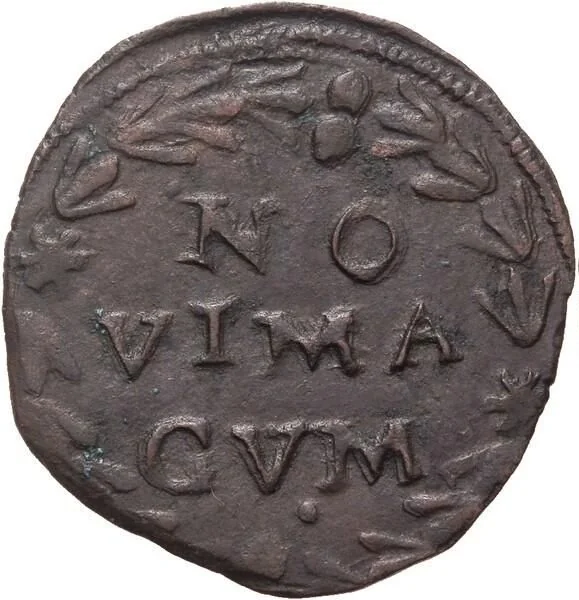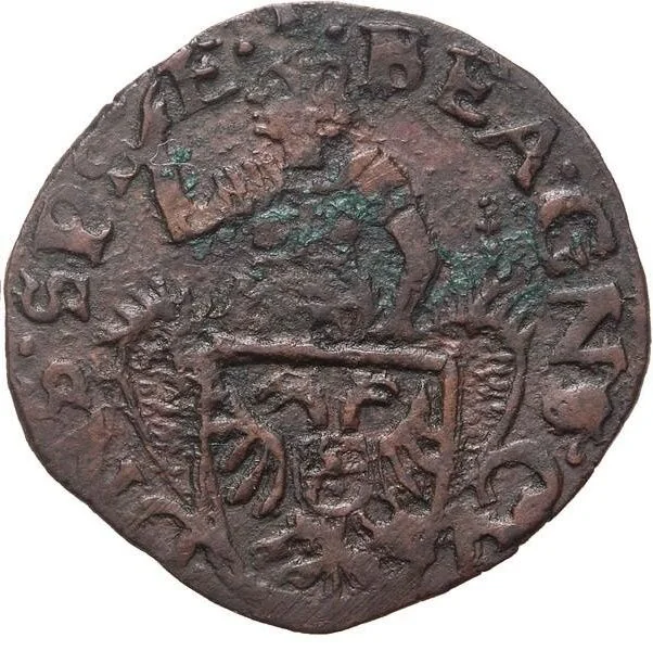 Woman seated in a garden, hand raised, with Nijmegen's coat of arms at her feet.