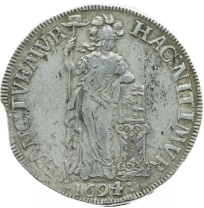 Female figure with spear and liberty cap, leaning on a Bible atop a column; date below.
