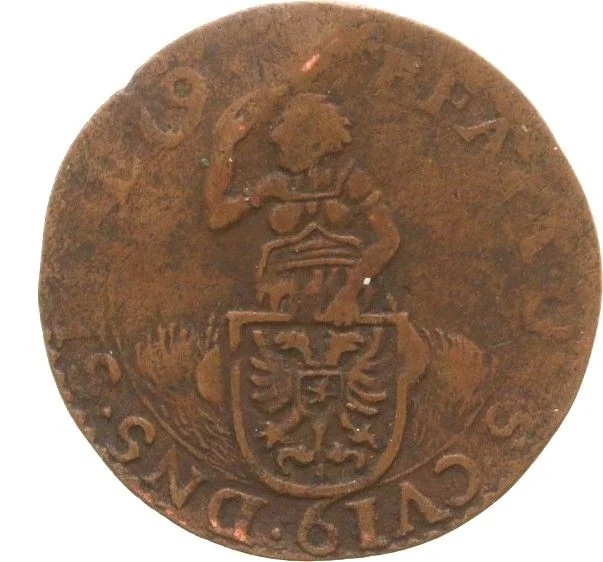 A female figure sits in a garden, her arm raised, within the shield of the Nijmegen coat of arms.