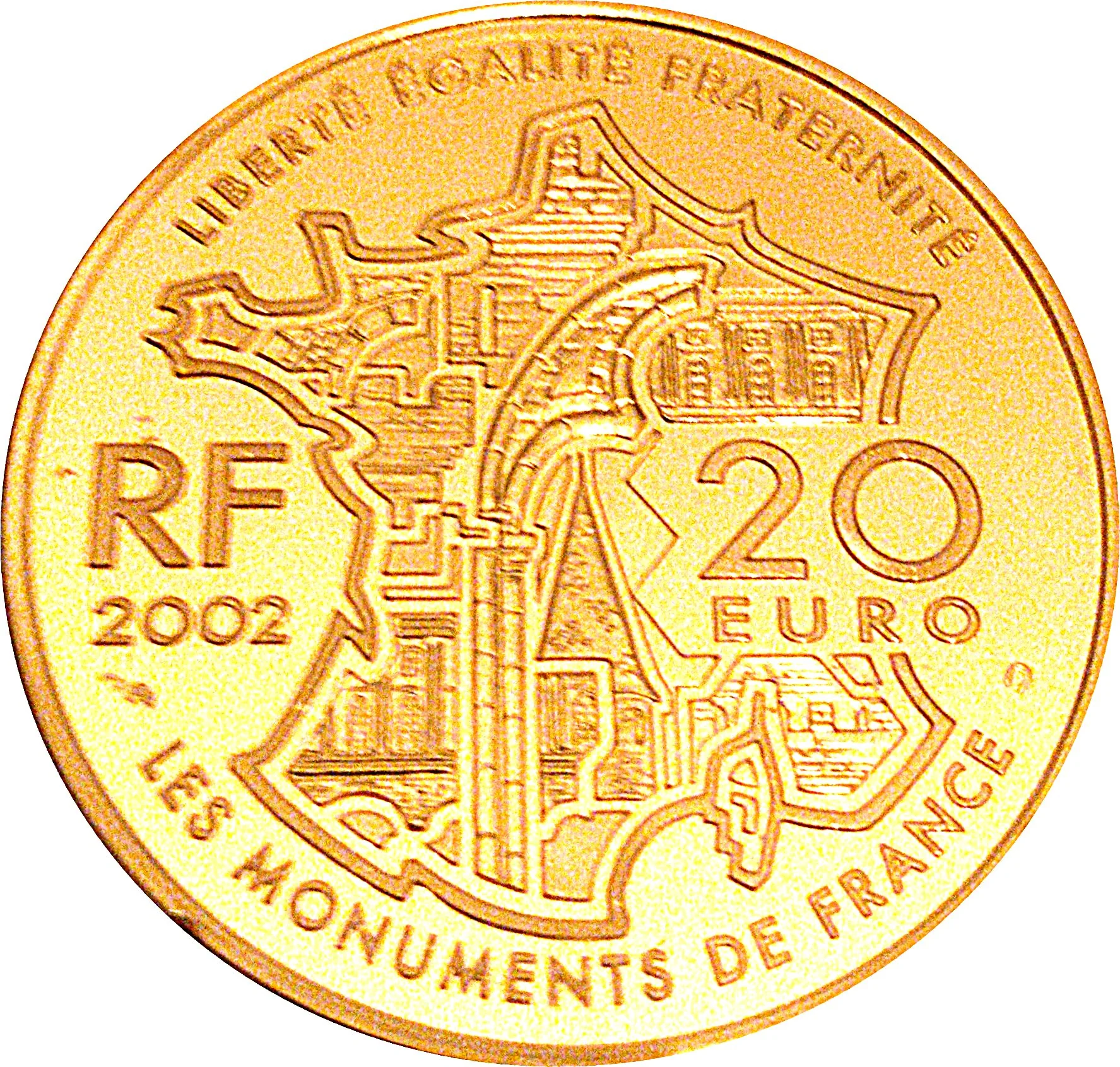 Description: Map of France featuring historical monuments. Inscriptions clockwise from top: "LIBERTÉ ÉGALITÉ FRATERNITÉ", "20 EURO", "LES MONUMENTS DE FRANCE", workshop marks, "2002", and "RF".