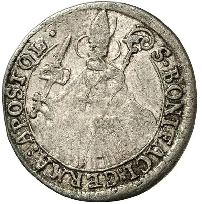 Half-length figure of St. Boniface holding sword and crook, encircled by legend.
