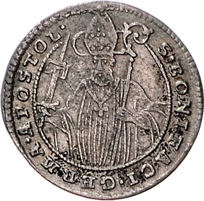 Half-length figure of St. Boniface holding sword and crook, encircled by legend.
