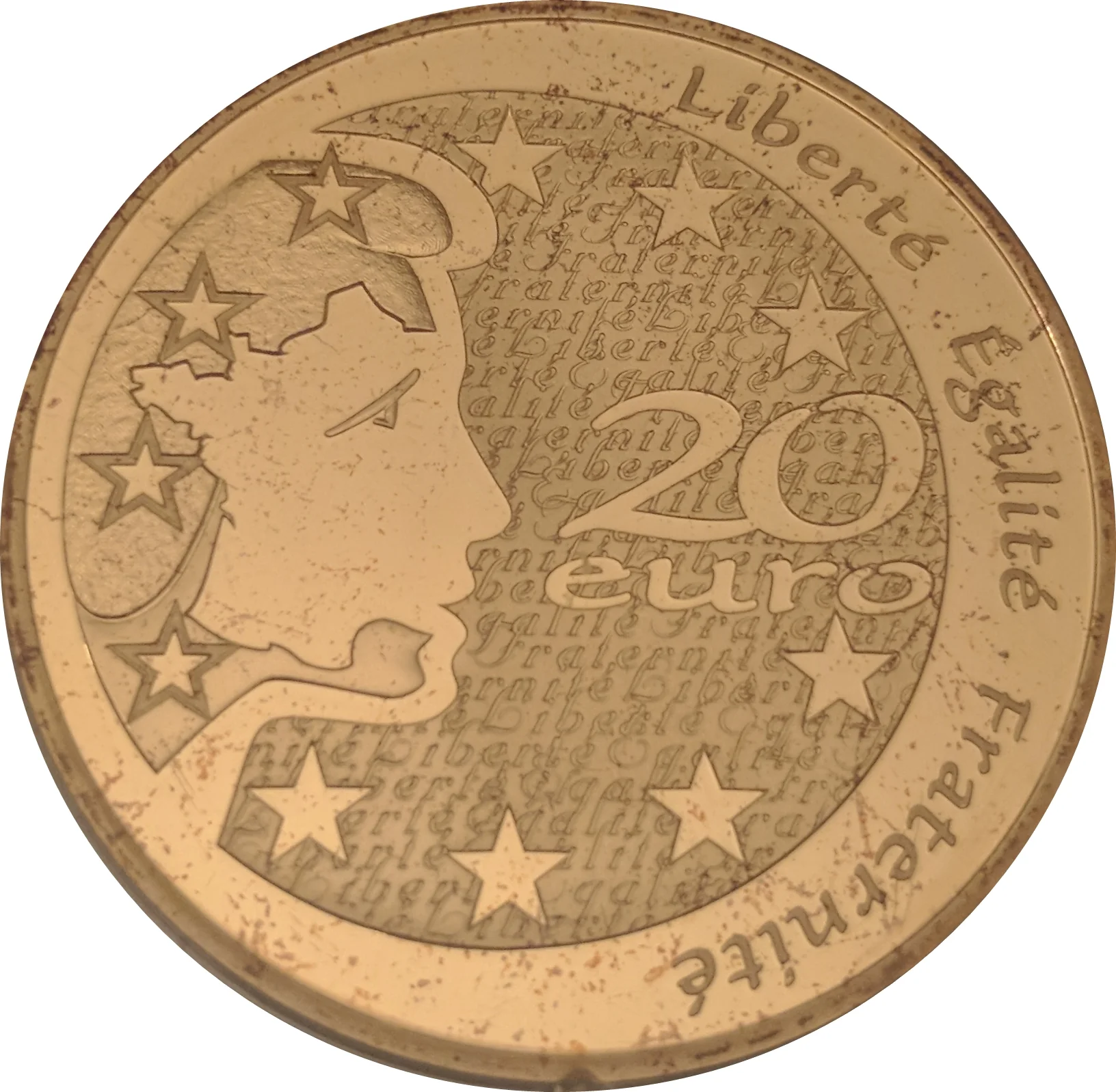 Marianne's head is a map of France, encircled by European stars. "Liberté Égalité Fraternité" and "20 euro" are on the right.