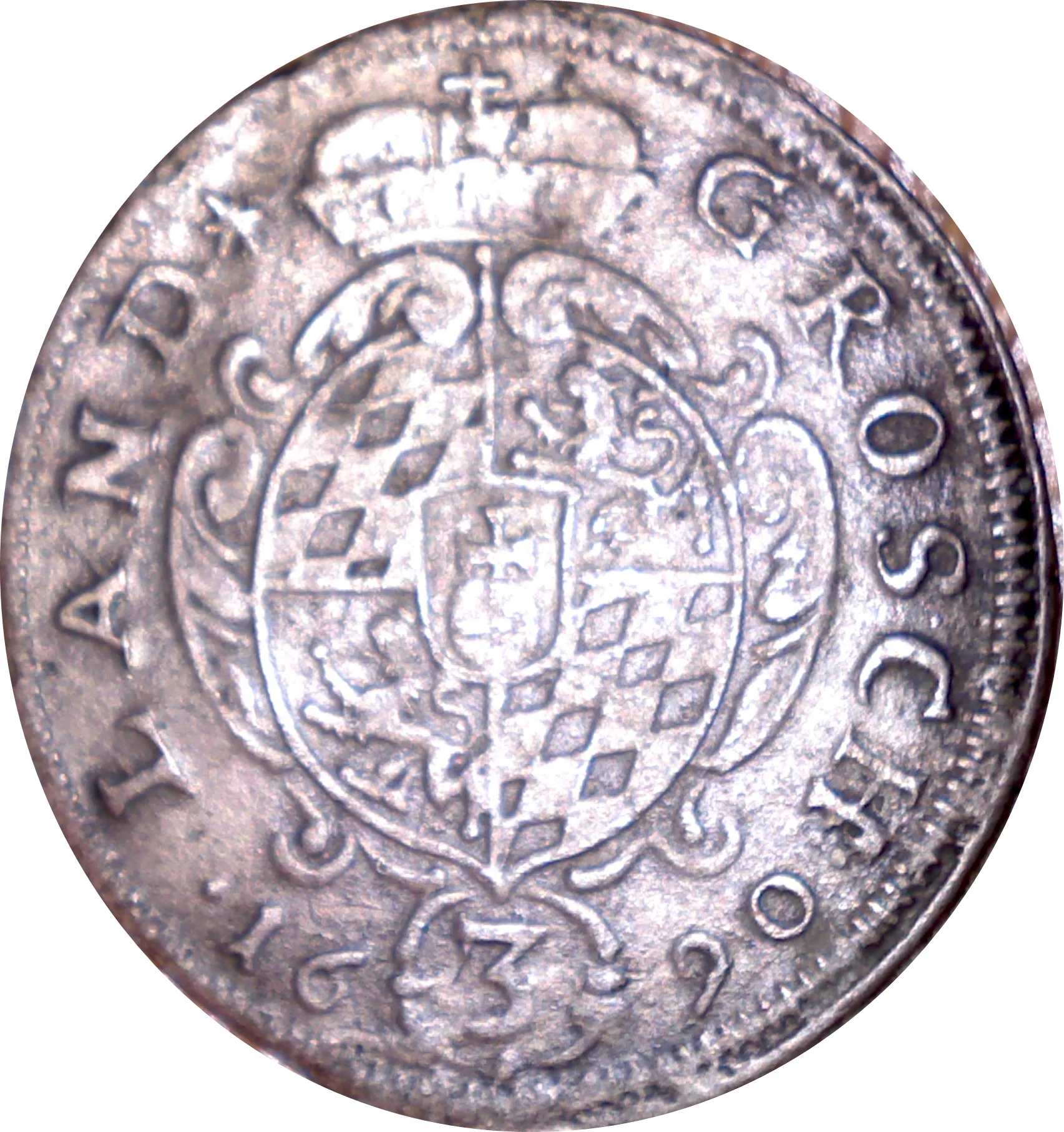 Shield with Bavarian and Palatine arms, central imperial orb, baroque frame, date flanked by value "3."