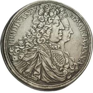 Conjoined busts of Ferdinand and Maria Anna, facing right.
