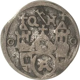 Church with twin towers, city arms above entrance, flanked by Q-H, mintmaster's symbol between towers.