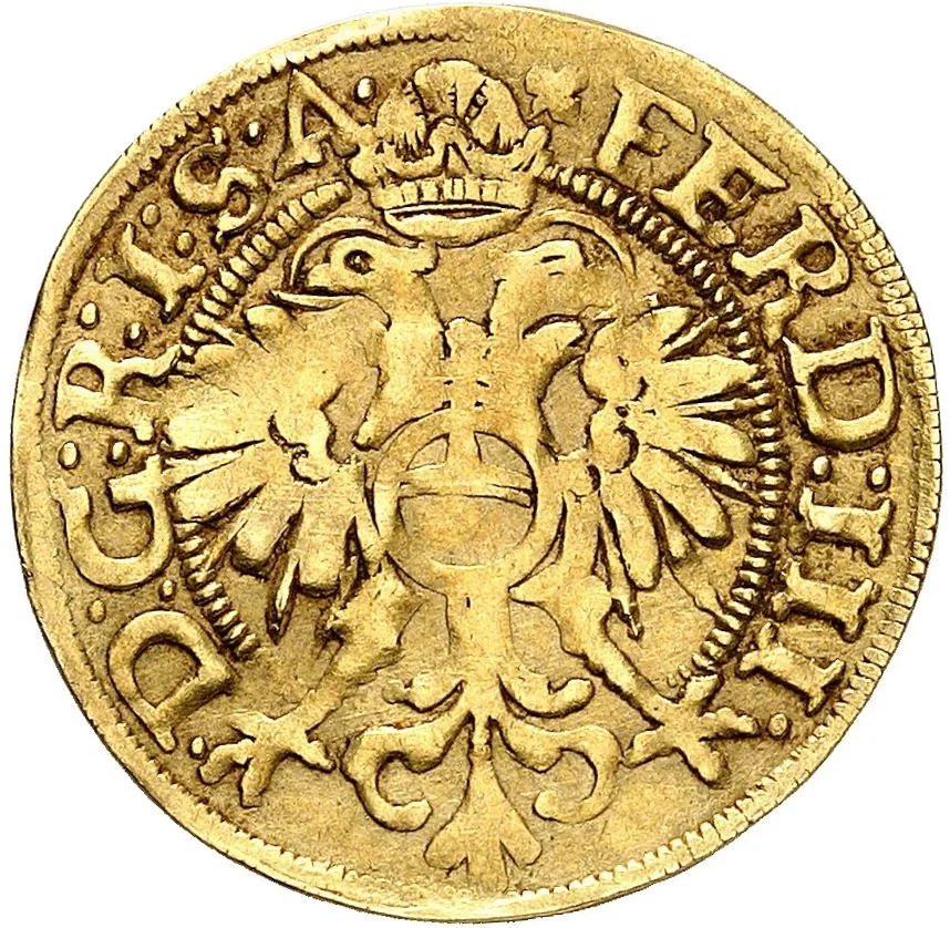 Two-towered church; mintmaster's symbol between towers, city arms above entrance, date in top margin.