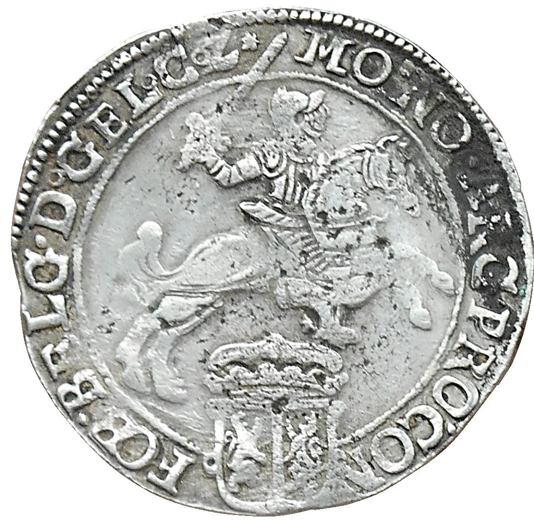 Armored knight on rearing horse, brandishing sword above a crowned Gelderland shield.