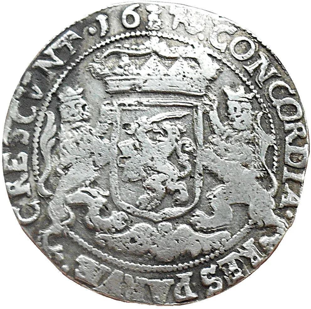 Shield of the United Provinces with crown, flanked by two standing lions. Date above, divided by mint mark (seated dog).